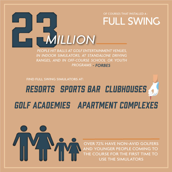 Our Full Swing golf simulators can be found in sports bars, apartment complexes, golf academies, resorts, and most importantly many clubhouses across the country. Having recently surveyed courses that had installed a Full Swing Simulator, over 72% have non-avid golfers and younger people coming to the course for the first time to use the simulators.